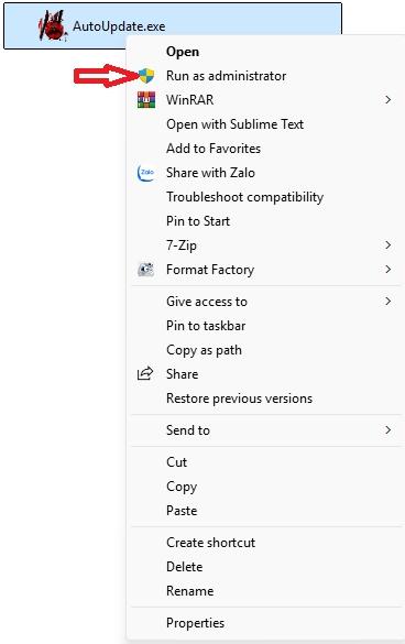- Lưu ý: Kích chuột phải vào File AutoUpdate.exe Chon Run as administrator mở file.